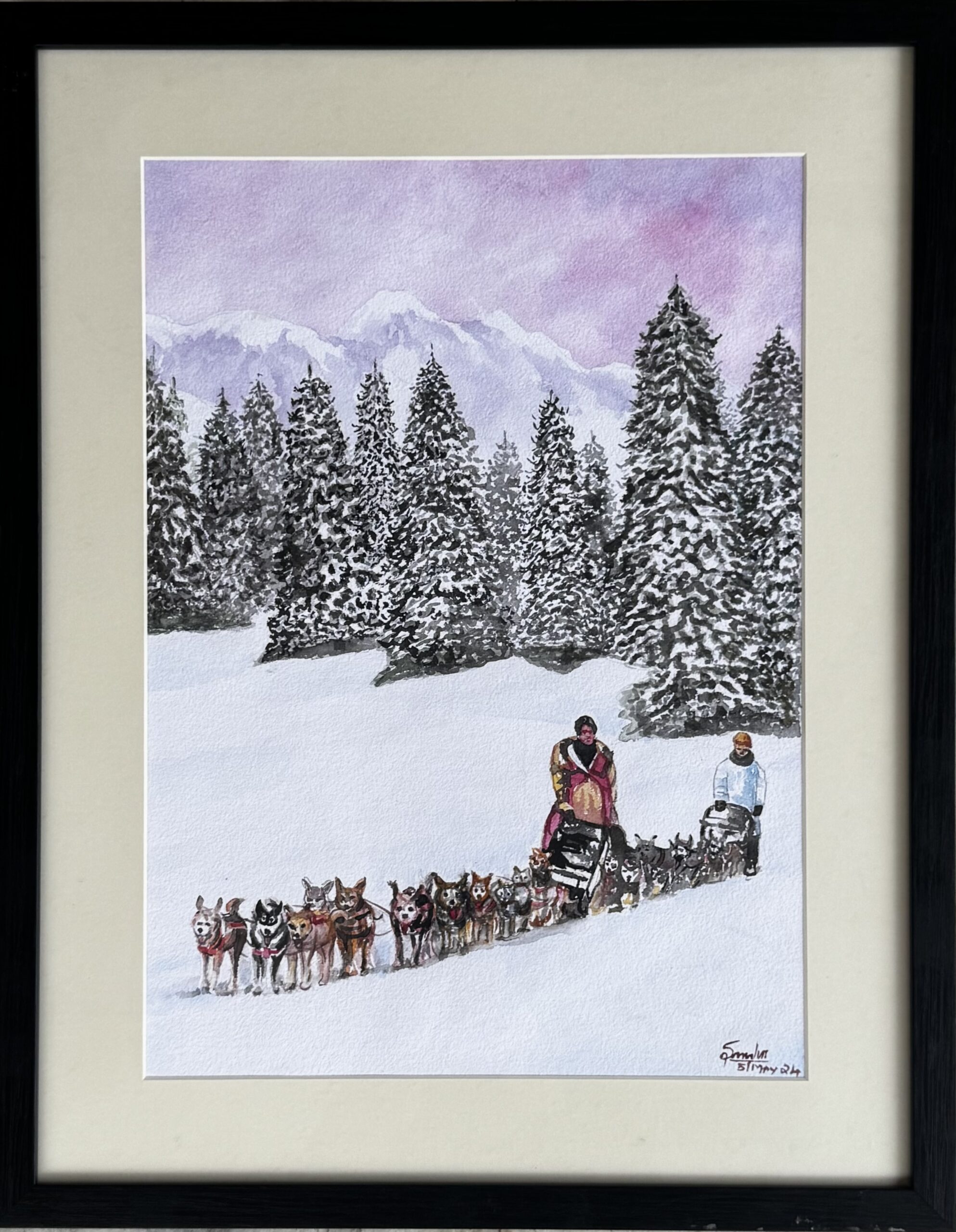Inspired by my own visit to Alaska, this painting reflects the quiet magic of a land shaped by snow, silence, and the steady rhythm of sled dogs in motion. In the vast white wilderness, their breath rises like soft clouds, their paws sketching fleeting patterns across the frozen ground as the musher guides them through forests, valleys, and blue-lit snowfields. This artwork captures not just the journey, but the bond, the endurance, and the timeless spirit of adventure that runs beneath the northern sky—where tradition and nature move together like poetry in motion.