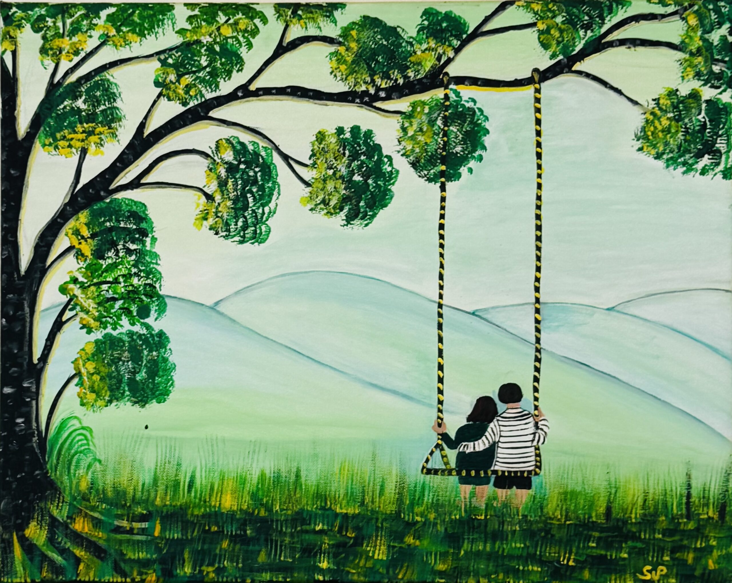 A serene moment shared between two souls under the shade of a quiet tree, surrounded by soft green hills and calm air. The painting captures a quiet, romantic moment where love and landscape become one.